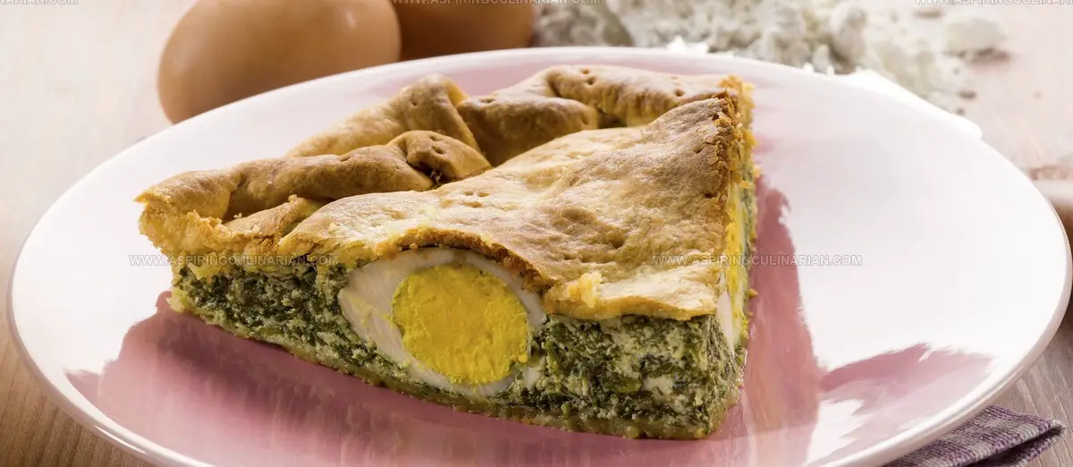 Swiss chard, spinach, and arugula create the green vegetable base of this rich pie, which generously includes fresh cheese and multiple eggs symbolizing the 12 apostles.