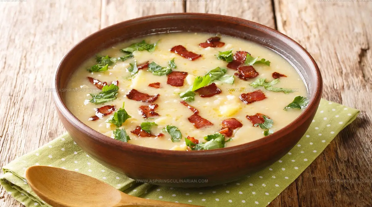 Crispy fried bacon and caramelized onions add savory depth to the soup's creamy foundation.