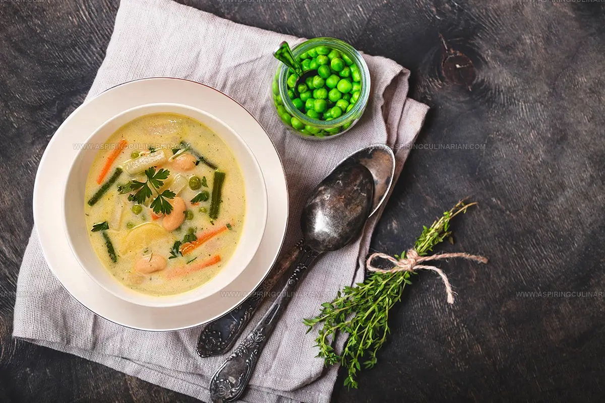 Chervil, a subtle anise-like herb, dominates this light soup's profile and provides its distinctive taste.