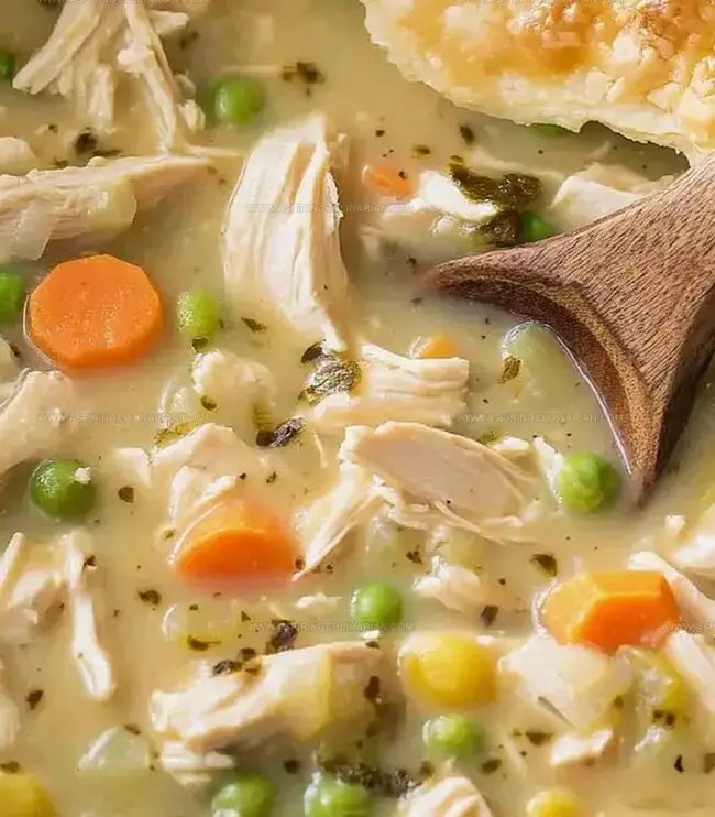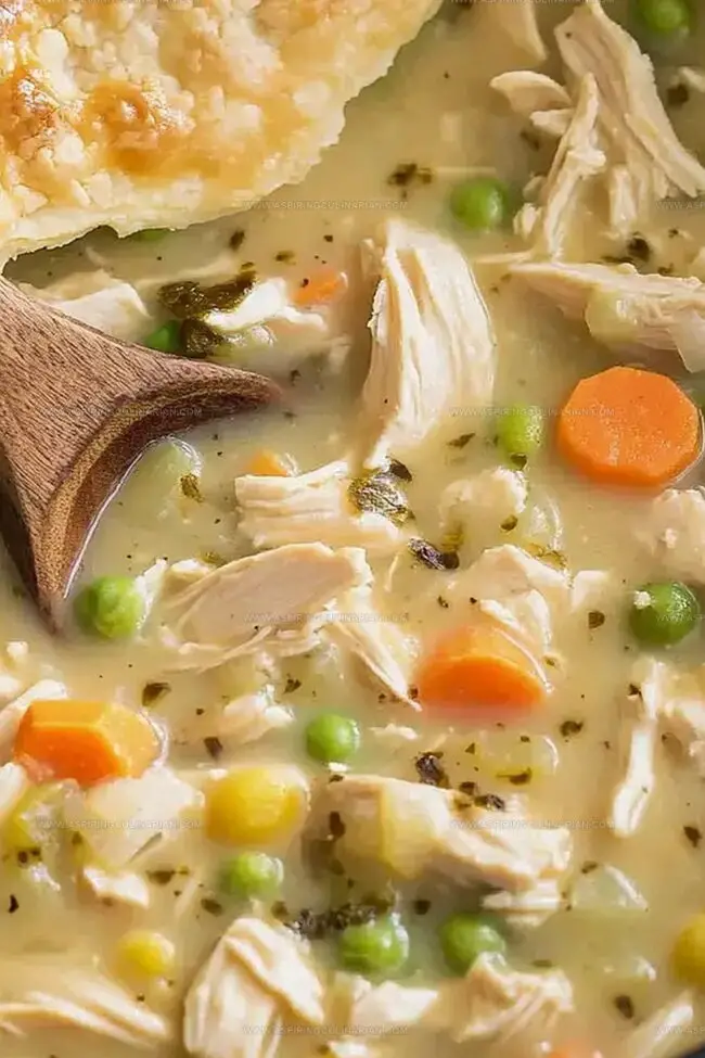 A creamy, flavorful broth swirls with tender chicken, soft vegetables, and golden pie crust crumbles that add just the right finishing touch.