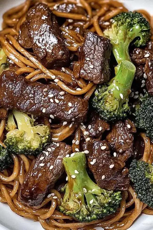 Tender strips of marinated beef mix with crisp broccoli and noodles, creating a balance of texture and flavor.