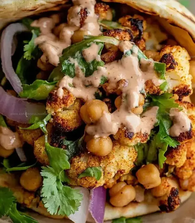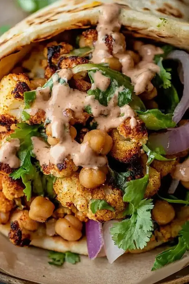 - Assemble wrap by spreading sauce on warm pita, layering crisp lettuce, roasted chickpea-cauliflower mixture, and topping with pickled onions.