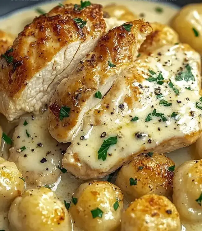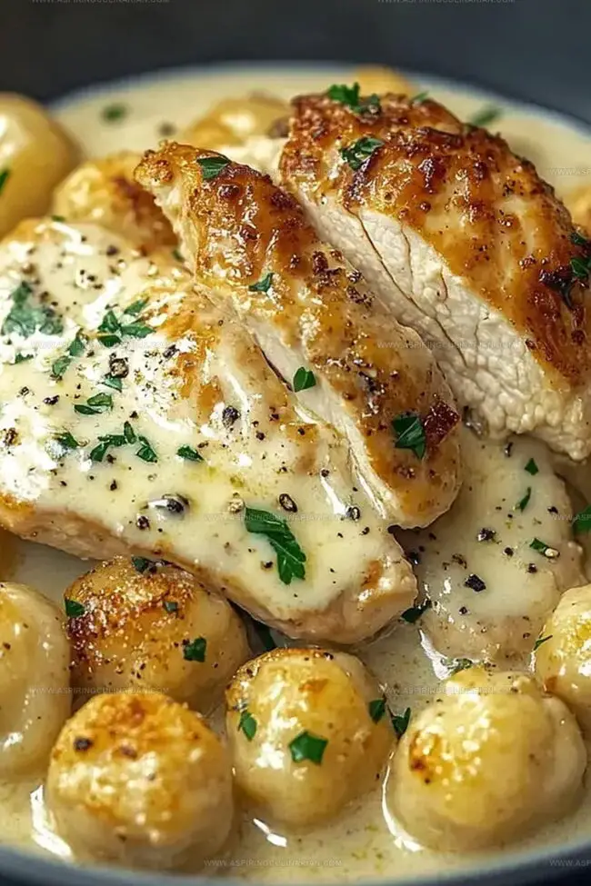 Tender chicken nestles perfectly alongside soft, pillowy gnocchi in a luxurious sauce.