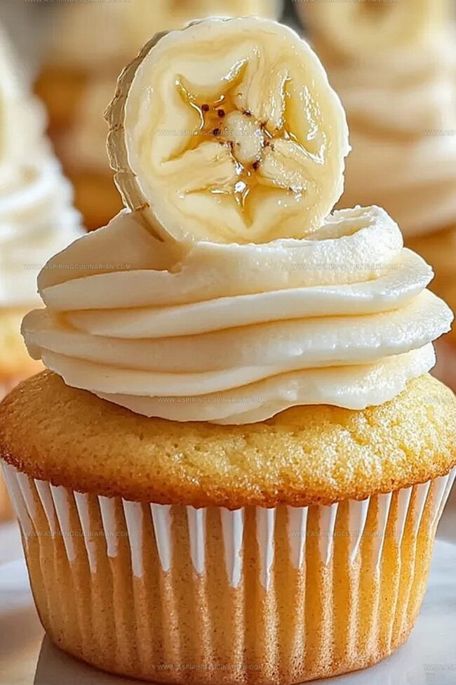 - Pipe or spoon whipped cream on top of each cupcake, creating an elegant finish. Garnish with a vanilla wafer and optional fresh banana slice for visual appeal.