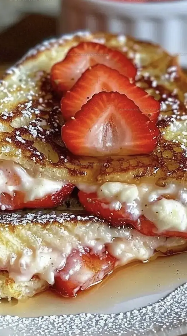 - Transfer to serving plates, garnishing with a delicate snowfall of powdered sugar, fresh strawberry slivers, and a cascading drizzle of maple syrup.
