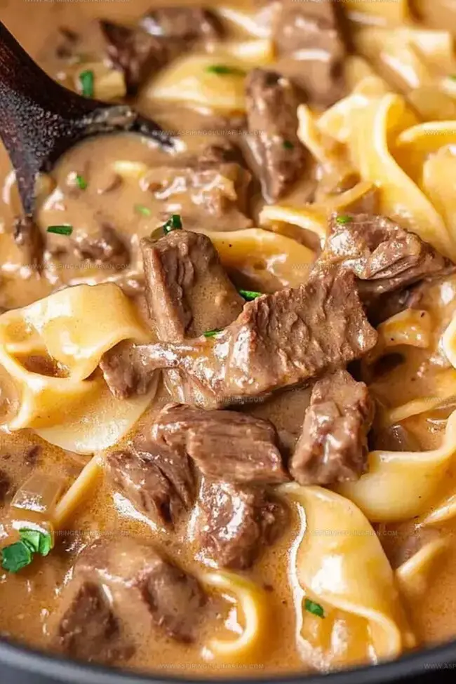 rich, creamy broth swirls with tender beef strips and perfectly cooked egg noodles.