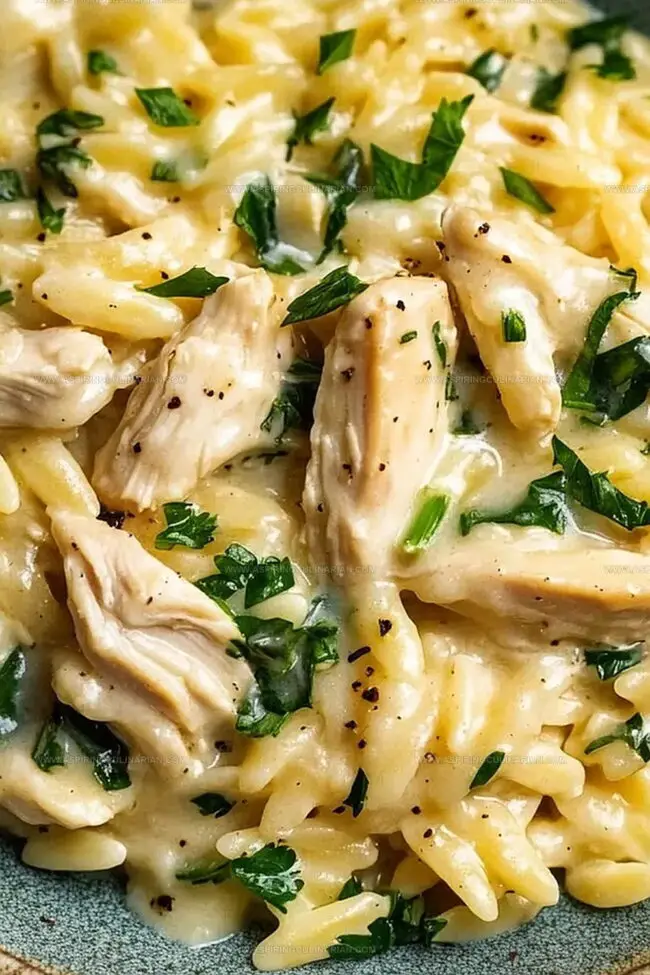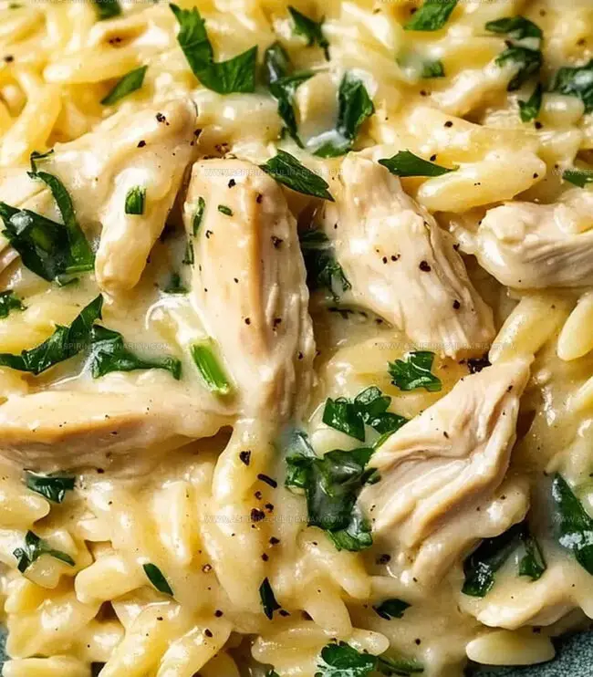 Tender chicken pieces nestle into a bed of silky, herb-infused orzo pasta.
