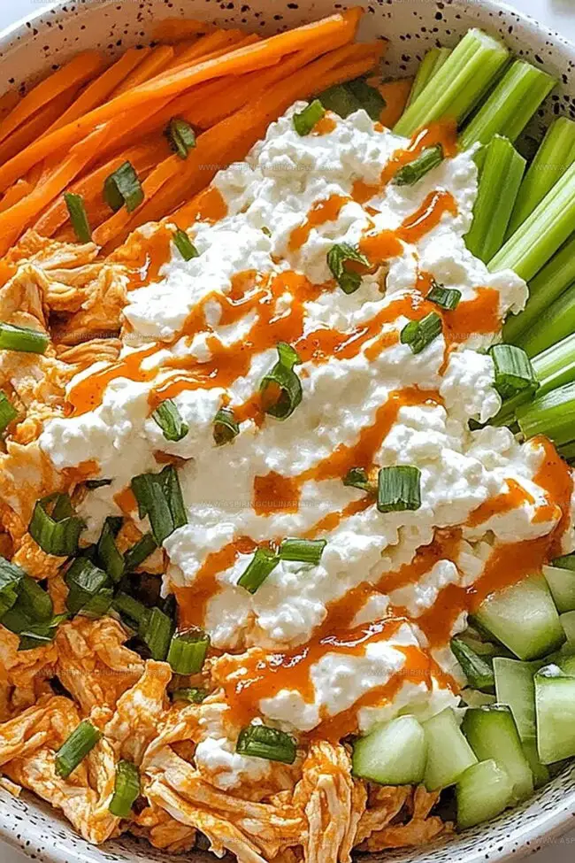 Protein Base:Fresh Vegetables:Finishing Touches:Easy Steps for Buffalo Chicken Cottage Cheese Bowls