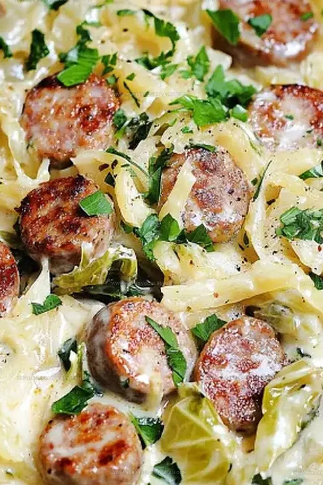 Hearty sausage and tender cabbage dance together in a creamy, rich sauce that screams pure indulgence.
