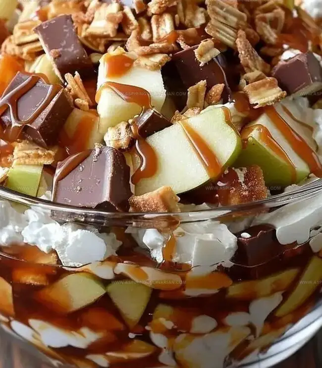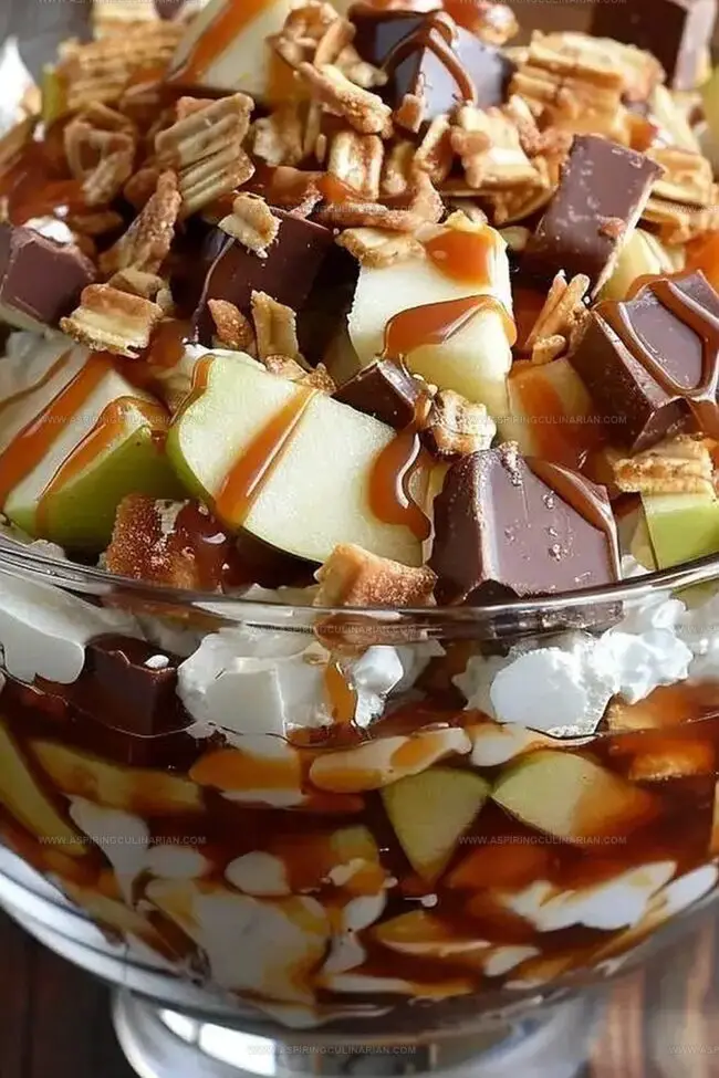 Crisp apples mingle with rich caramel and chunks of chocolate-covered candy bars, creating a playful twist on traditional fruit salads.