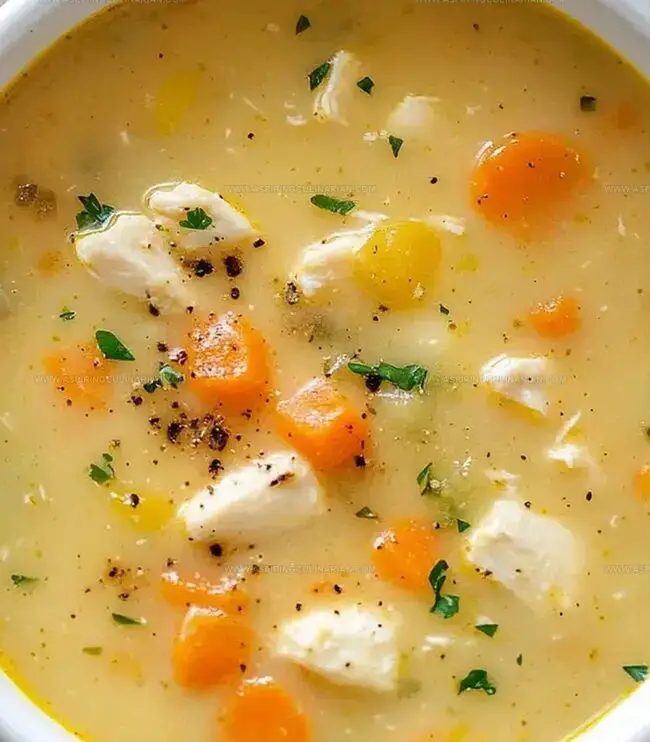 Aromatic herbs dance subtly within the rich, golden broth, enhancing the natural sweetness of carrots and earthiness of potatoes.