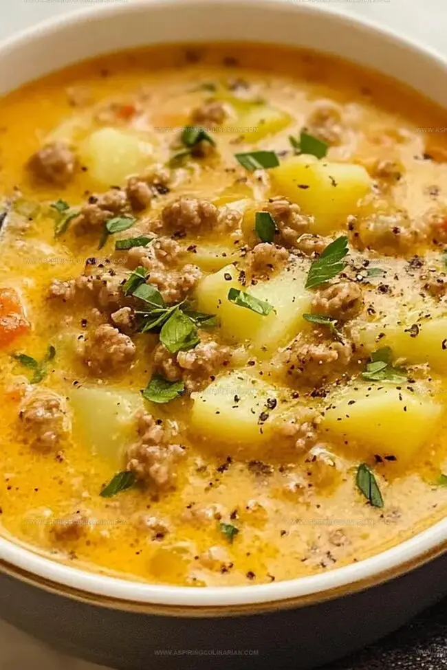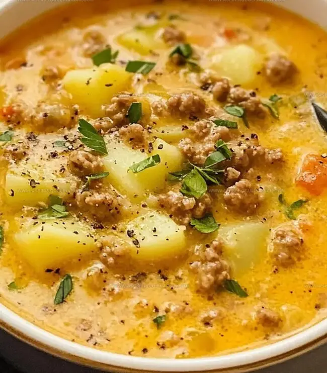 Comfort arrives in a steaming bowl of hearty, creamy cheesy hamburger potato soup that promises pure warmth and satisfaction.