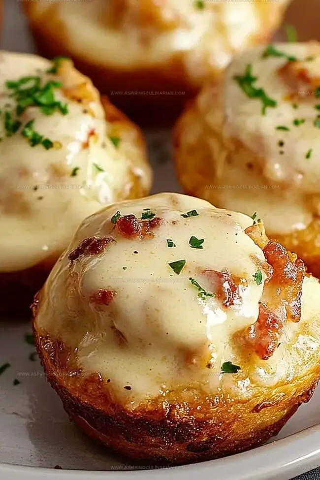 - Immediately after removing from the oven, lavishly brush the puffs with the reserved garlic parmesan butter mixture. Allow a brief 2-3 minute cooling period before carefully extracting from the muffin pan. Serve while warm, accompanied by extra alfredo sauce for dipping pleasure.