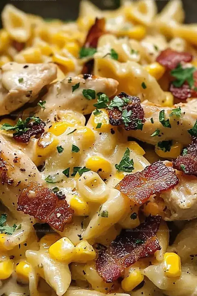- Unite perfectly cooked pasta, tender chicken, crispy bacon fragments, and reserved corn kernels in harmonious blend.