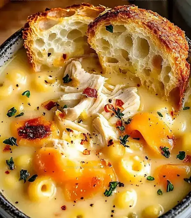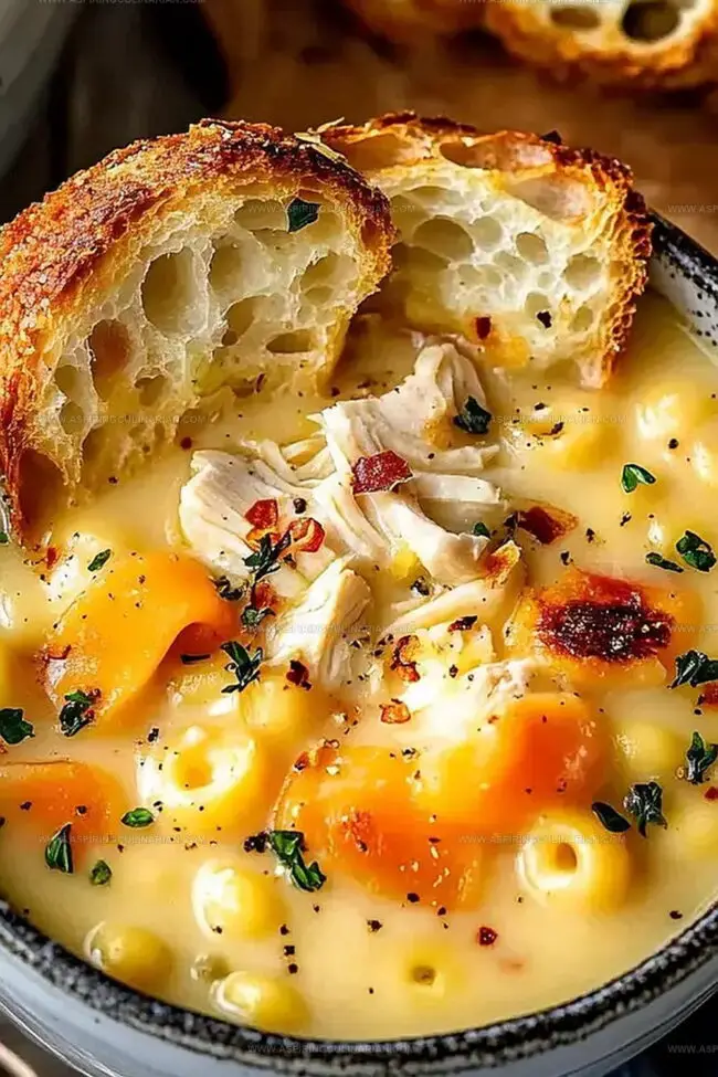 Hearty chicken macaroni cheese soup delivers comfort in a single spoonful, blending creamy richness with tender pasta and succulent chicken. Savory warmth promises to wrap you in delicious satisfaction, making each bite a delightful culinary escape.