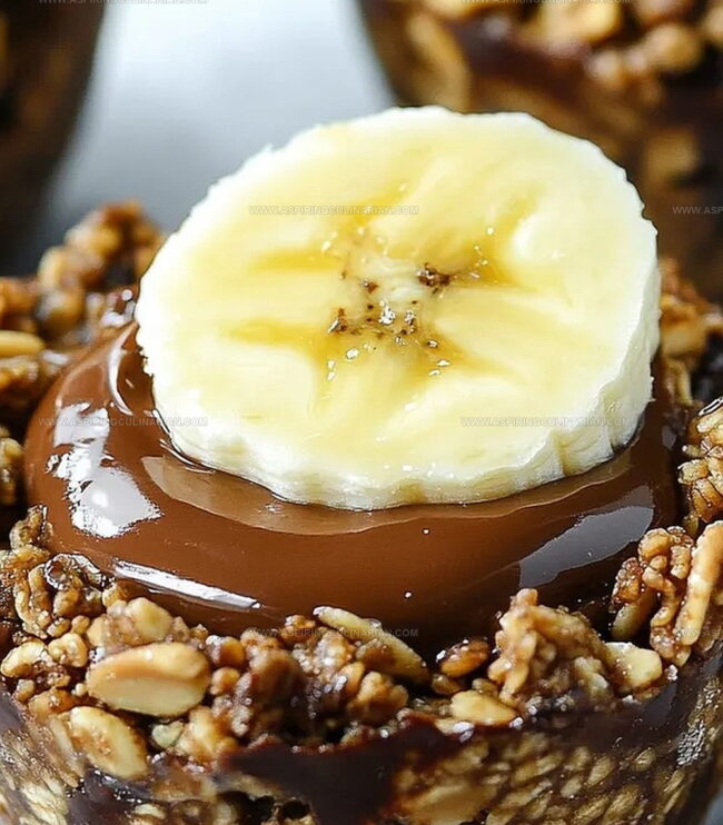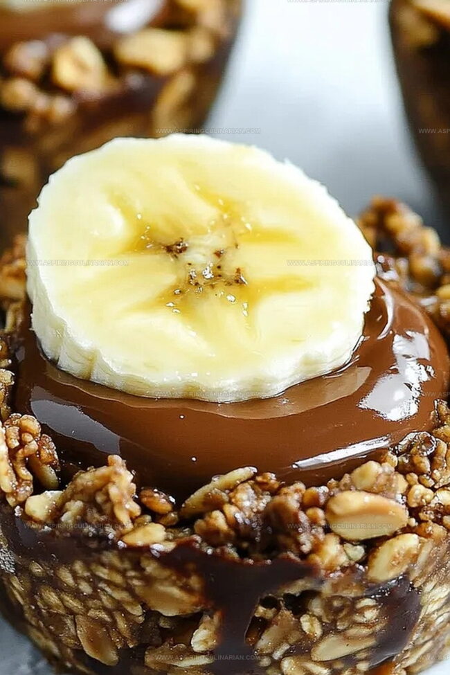- Warm peanut butter slightly for easier spreading. Fill each chocolate granola cup completely, ensuring smooth surface. Optional: Garnish with fresh banana slice for added visual appeal.