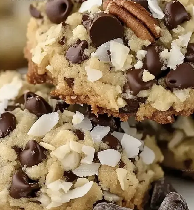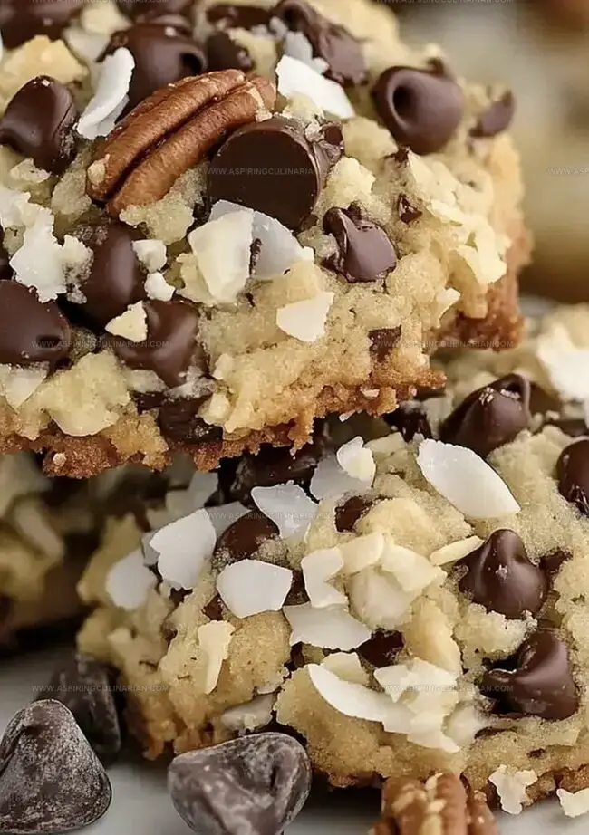 - Combine coconut flakes, chocolate chips, and chopped pecans in a large mixing bowl, creating a rich textural base.