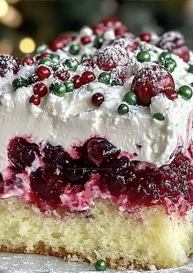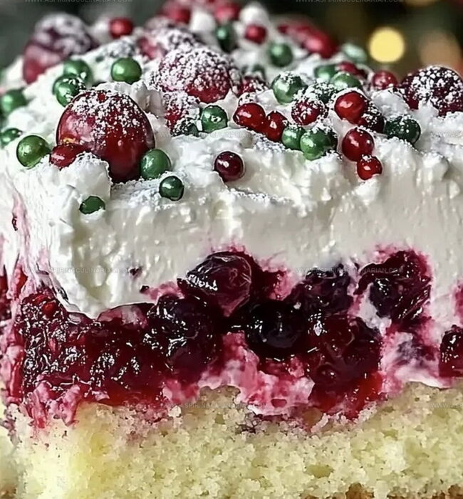 Festive Christmas Cranberry Poke Cake weaves holiday magic through layers of moist vanilla cake and tart cranberry glaze. Sweet cream cheese frosting crowns this seasonal dessert, inviting you to savor Christmas cheer with each delightful bite.
