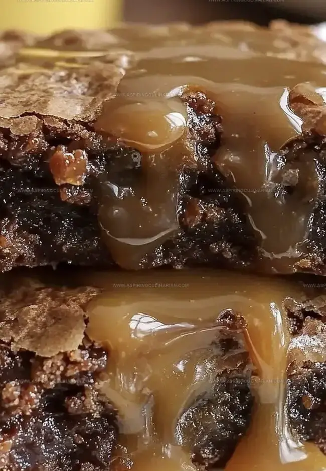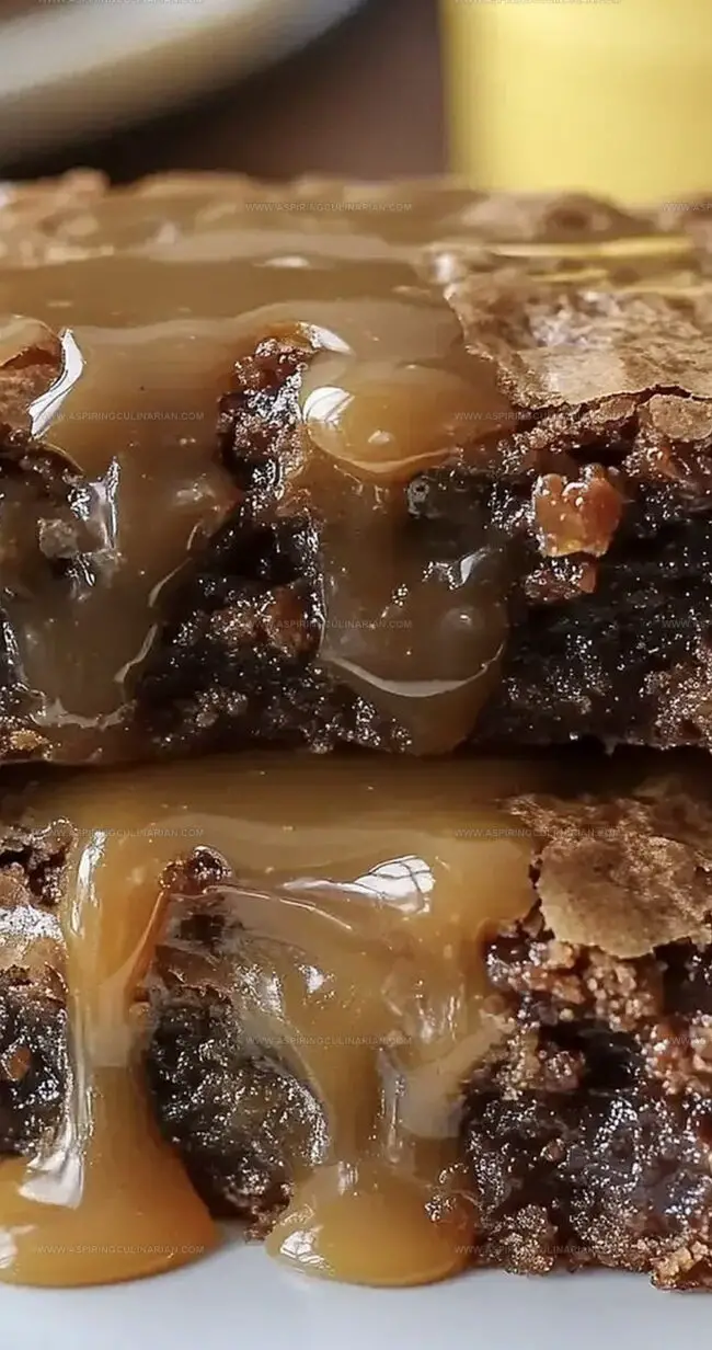 - Immediately after removing from the oven, generously cascade warm caramel sauce across the surface of the freshly baked brownies, allowing it to seep into the rich, chocolatey layers.