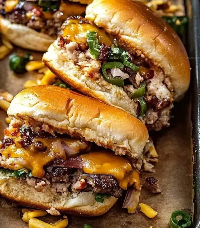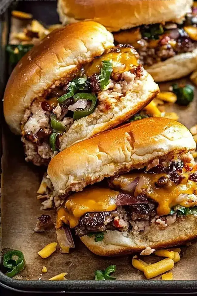 These mini sandwiches combine bold flavors with classic American ingredients like beef, bacon, and spicy jalapeños, creating a hearty and zesty meal perfect for casual gatherings.