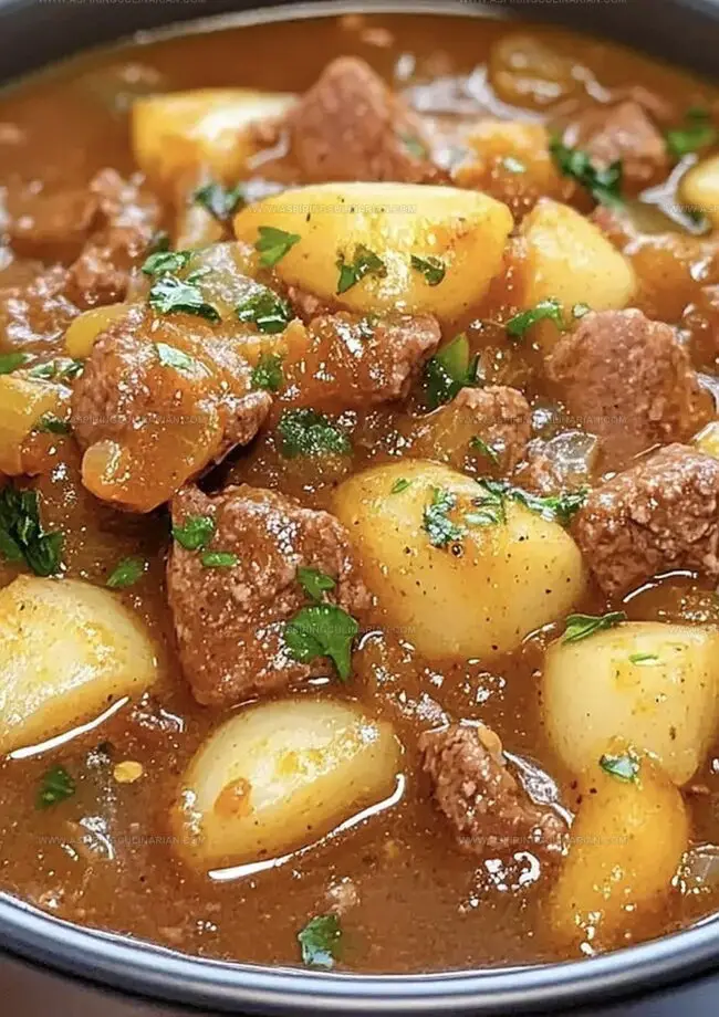 Beef chunks simmer alongside hearty vegetables in a rich, deeply seasoned broth.