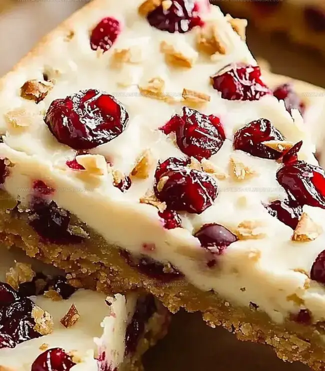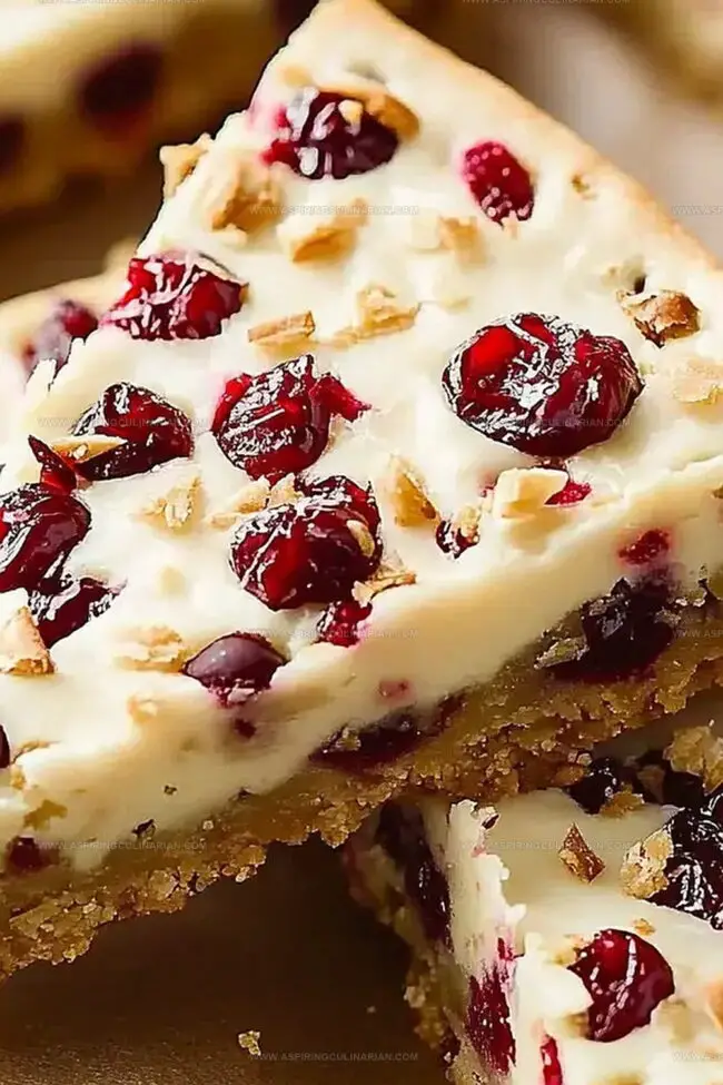 Dried cranberries and white chocolate give these bars their signature sweet-tart flavor and festive look, creating a perfect holiday dessert that’s both rich and tangy.