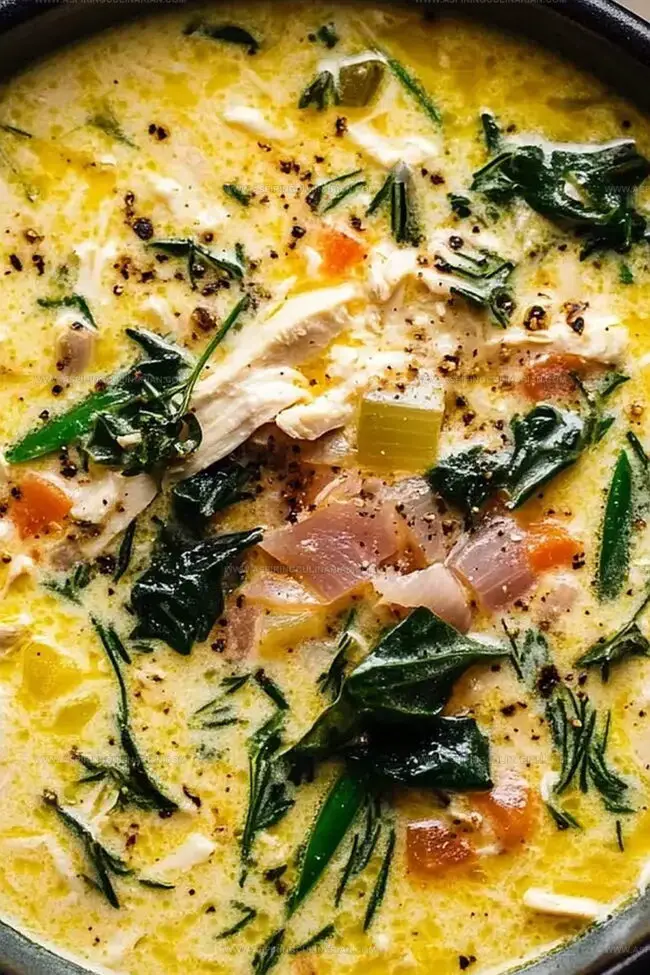 Tender chicken pieces nestle in a luxurious broth, creating a warm embrace of deliciousness.