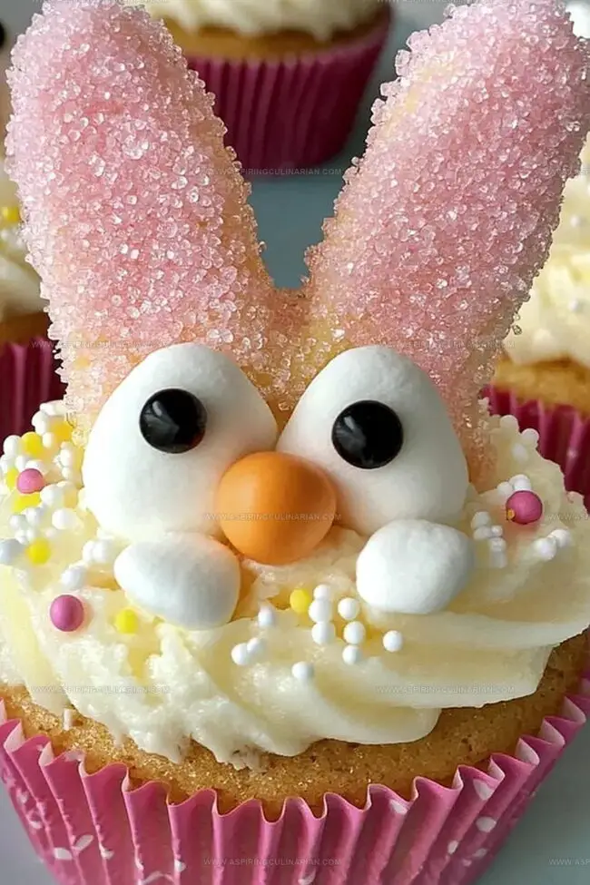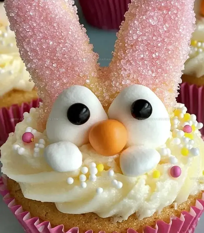 - Position marshmallow ears into frosting at the cupcake’s top, angling pink sides inward to create a realistic ear shape.