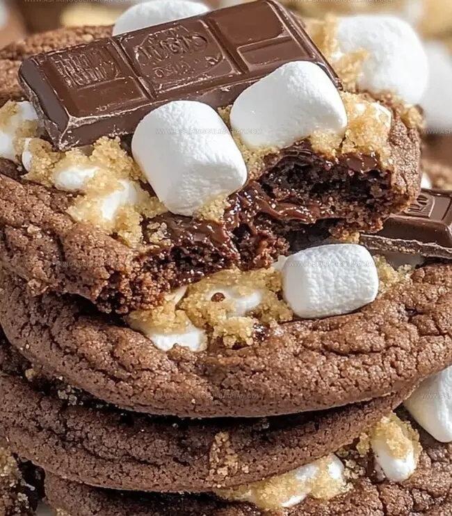 These cookies combine classic s’mores flavors with a traditional chocolate cookie base, featuring marshmallows and graham crackers baked directly into the cookie for a unique campfire-inspired treat.