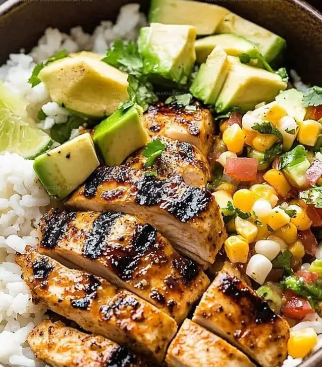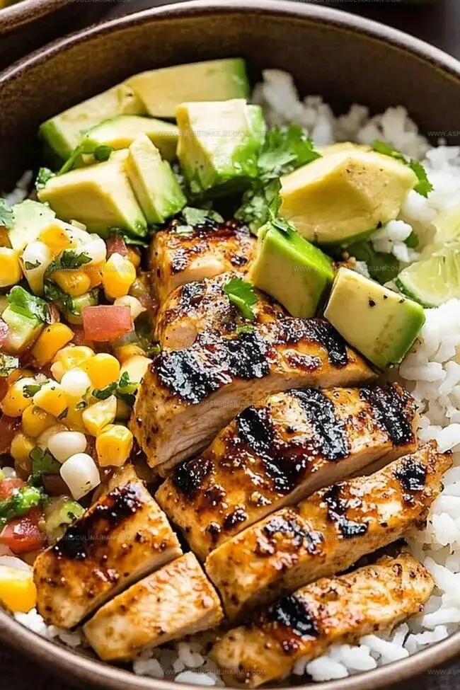 Protein:Marinade Ingredients:Rice Base:Salsa Components:Garnish and Topping:Steps for Chicken Rice Bowls