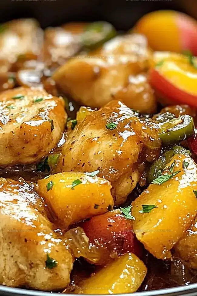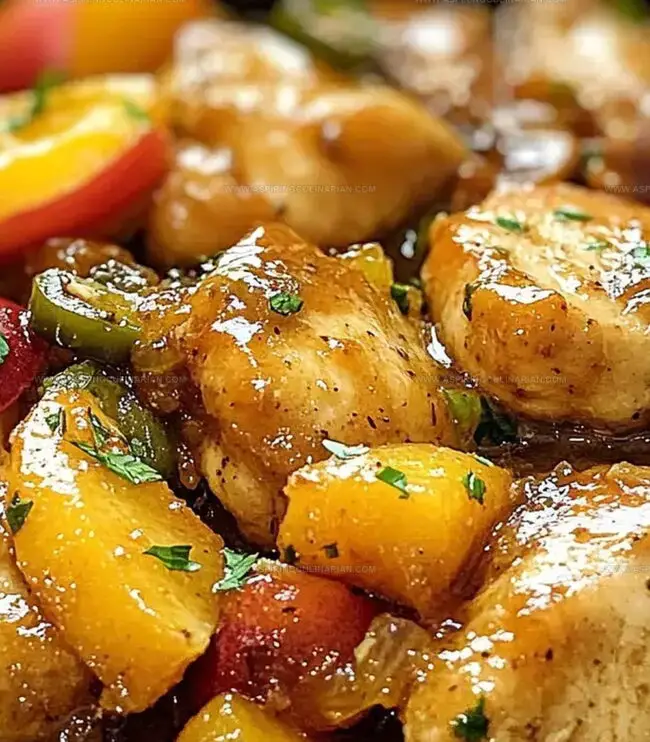- Carefully return the chicken to the skillet, nestling the pieces among the glazed fruits and peppers. Spoon additional glaze over the chicken for maximum flavor infusion.