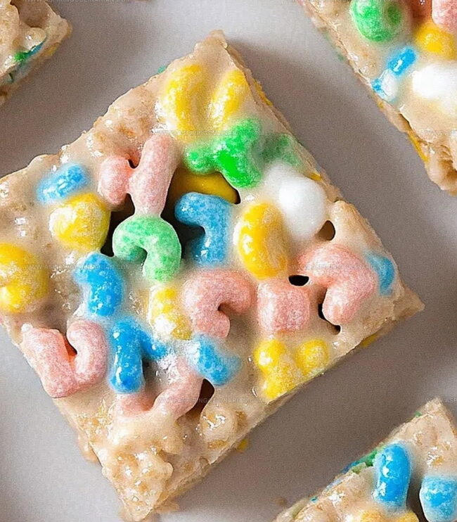 Colorful cereal pieces dance through gooey marshmallow goodness, creating a snack that sparks joy with every bite.