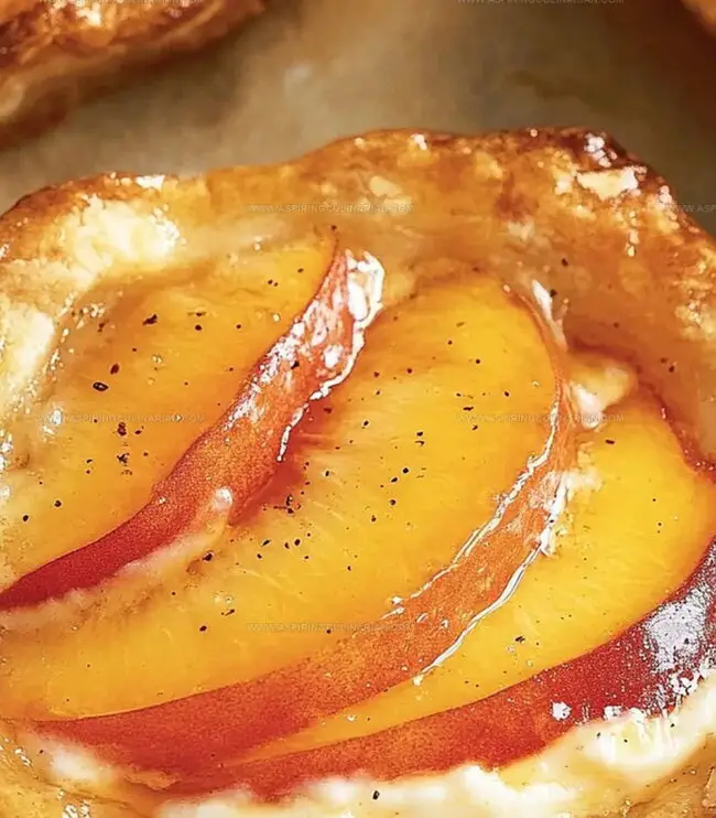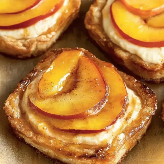 - Gently elevate edges of each pastry square to create rustic border. Spread cream cheese as base layer, drizzle honey mixture, and artfully arrange peach slices. Delicately brush pastry edges with cream and dust with cinnamon sugar.