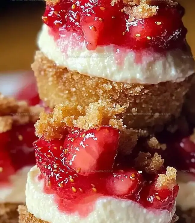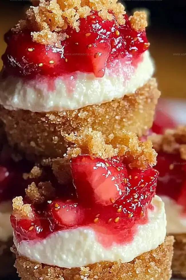 Delightful mini strawberry crunch cheesecake bites combine creamy richness with crisp texture, creating a perfect balance of sweet and tangy flavors. Guests will crave these irresistible little desserts that promise pure indulgence in every single bite.