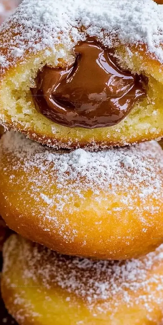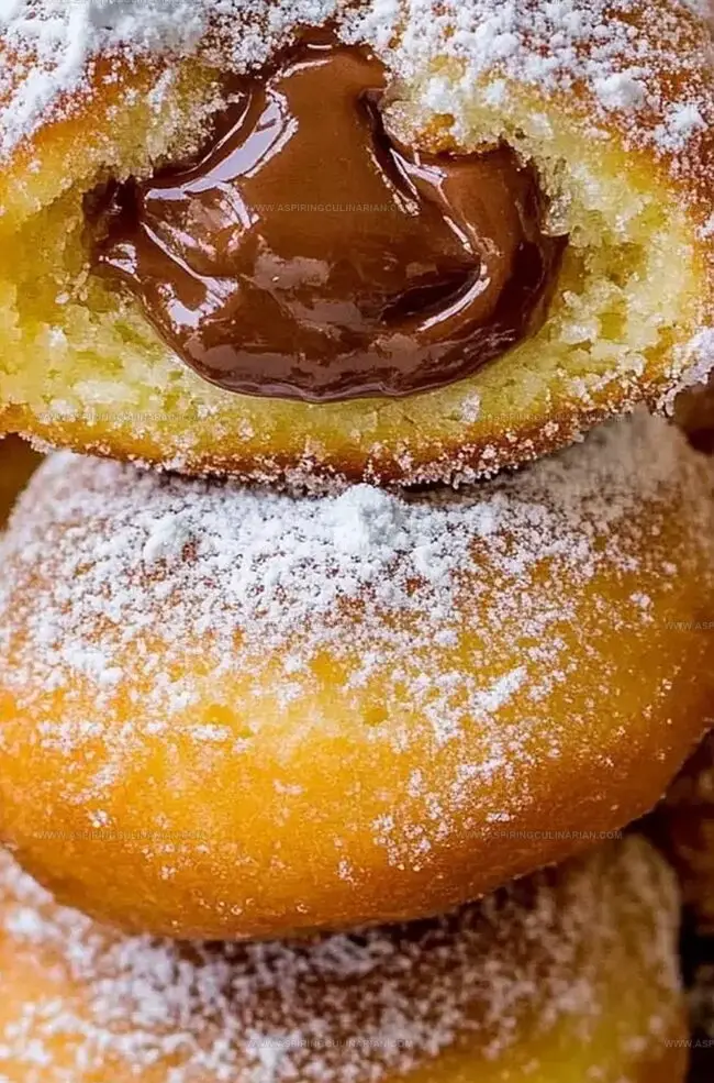 - Create a small opening in each donut using a toothpick. Gently pipe warm Nutella into the center, filling until the donut appears plump and generously stuffed. Optionally, drizzle additional Nutella on top for extra indulgence.