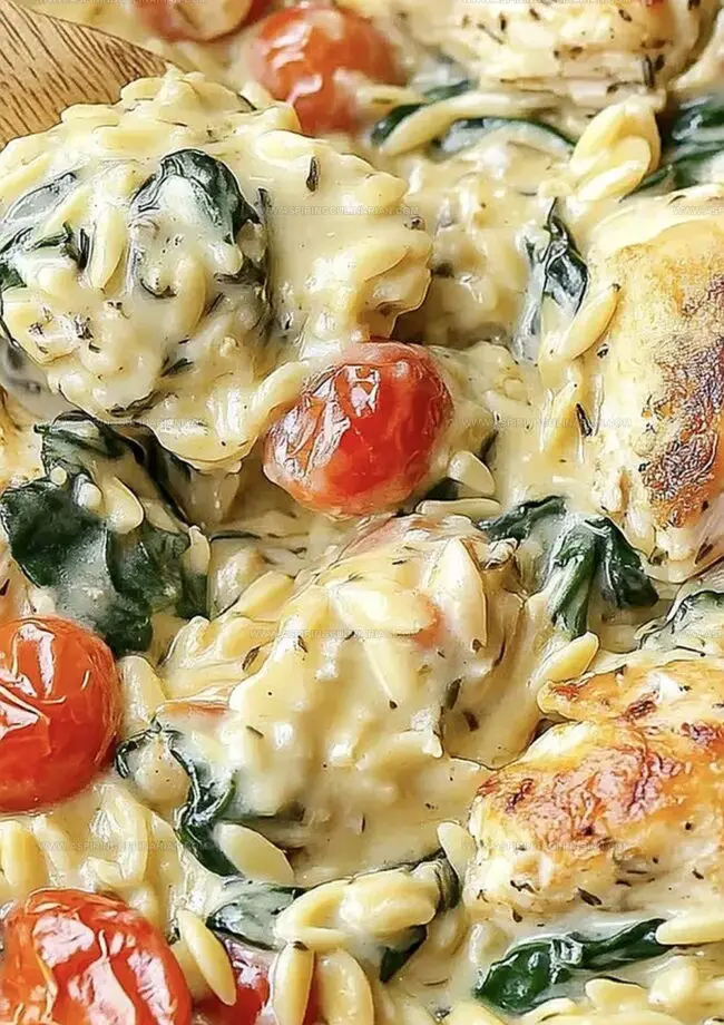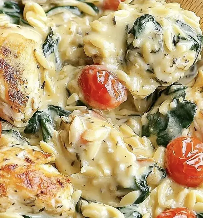 - Layer orzo, chicken, and aromatic ingredients directly into the dish, carefully mixing chicken stock, cream, garlic, spinach, tomatoes, lemon juice, Italian seasoning, salt, and pepper to develop a harmonious flavor profile.