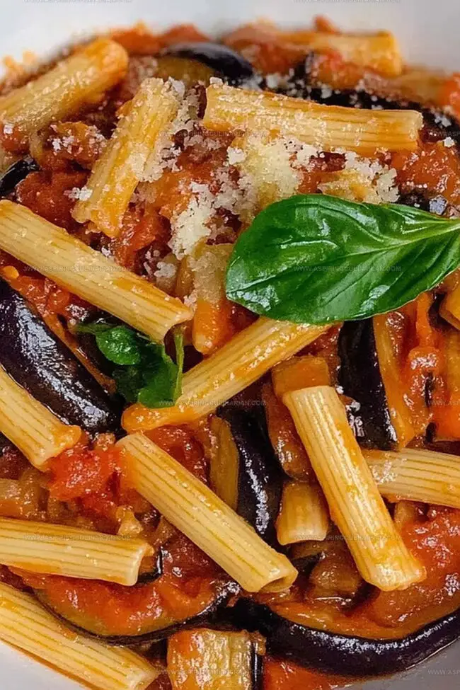 - Combine partially cooked pasta with sauce, adding reserved pasta water. Toss remaining eggplant pieces into the mixture. Cook for 2 minutes to complete pasta and integrate flavors.