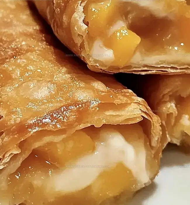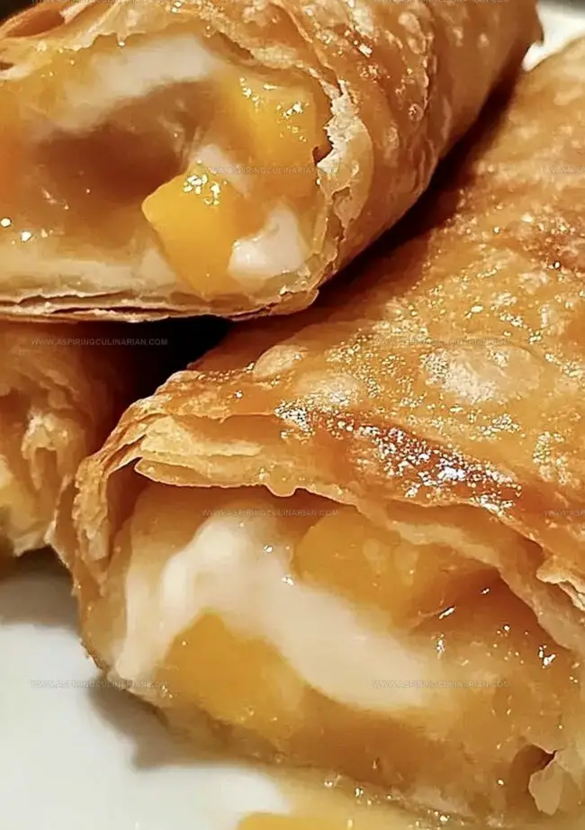 Crispy golden egg rolls stuffed with creamy peach cobbler cheesecake create an unexpected dessert fusion that sparks pure culinary excitement.