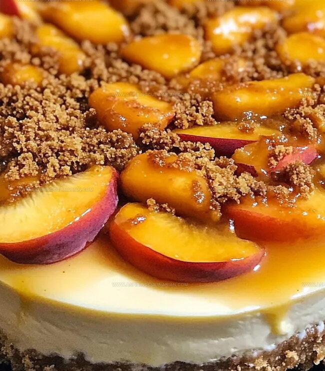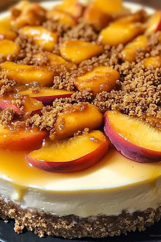 - Unveil the chilled cheesecake by removing springform sides. Generously drape the peach mixture across the surface, allowing syrup to cascade decoratively. Scatter cinnamon crumble around the perimeter if desired.