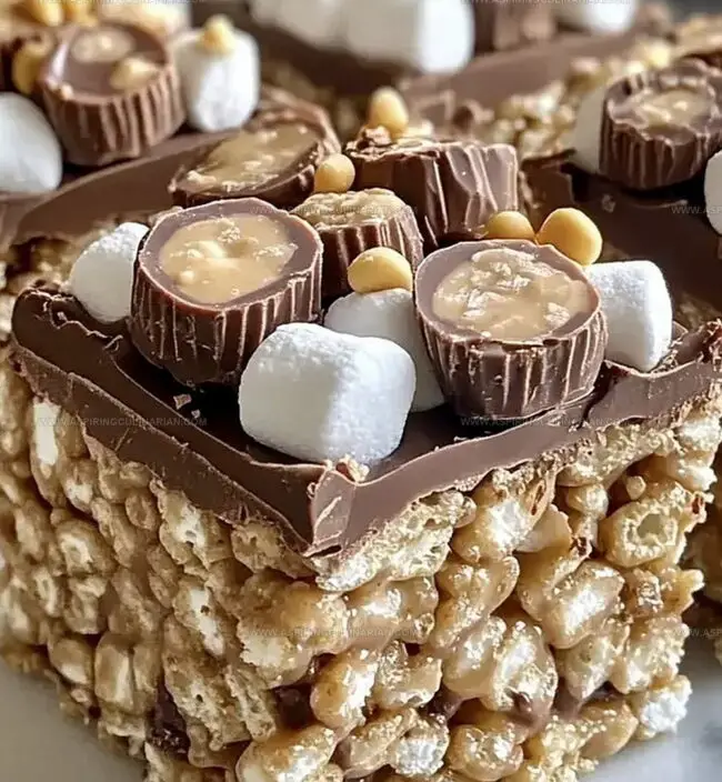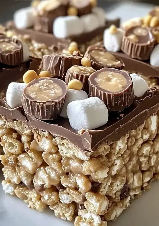 Indulgent peanut butter cup rice krispies treats merge classic childhood snacks with chocolatey decadence. Chocolate-studded marshmallow squares deliver a nostalgic crunch that satisfies sweet cravings with irresistible charm.