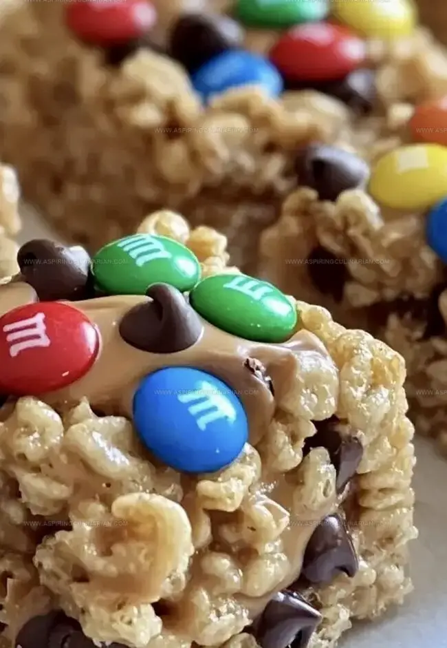 - Generously distribute mini chocolate chips and colorful M&M’s across the surface, gently pressing them into the sticky treat to ensure they adhere securely.