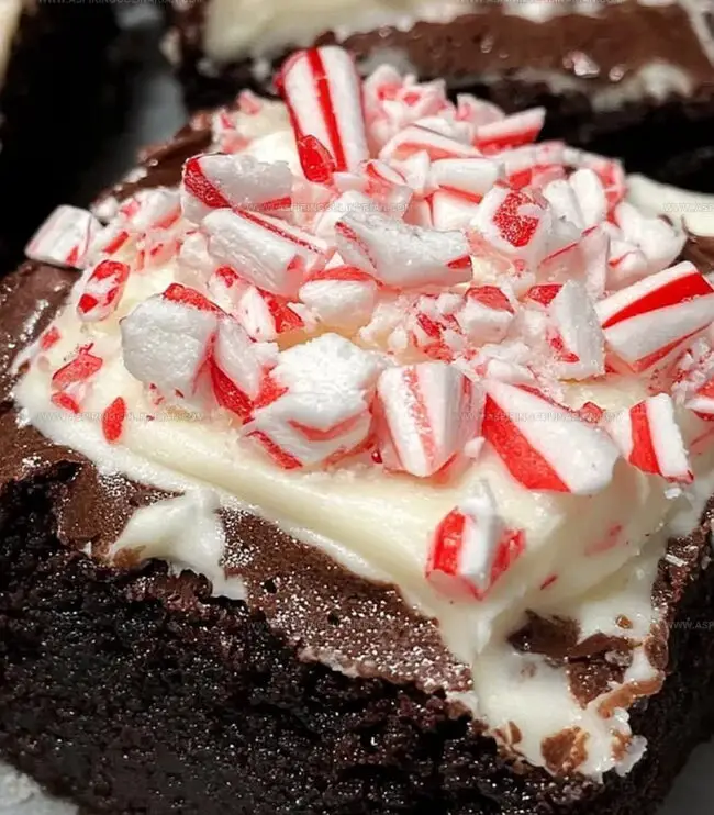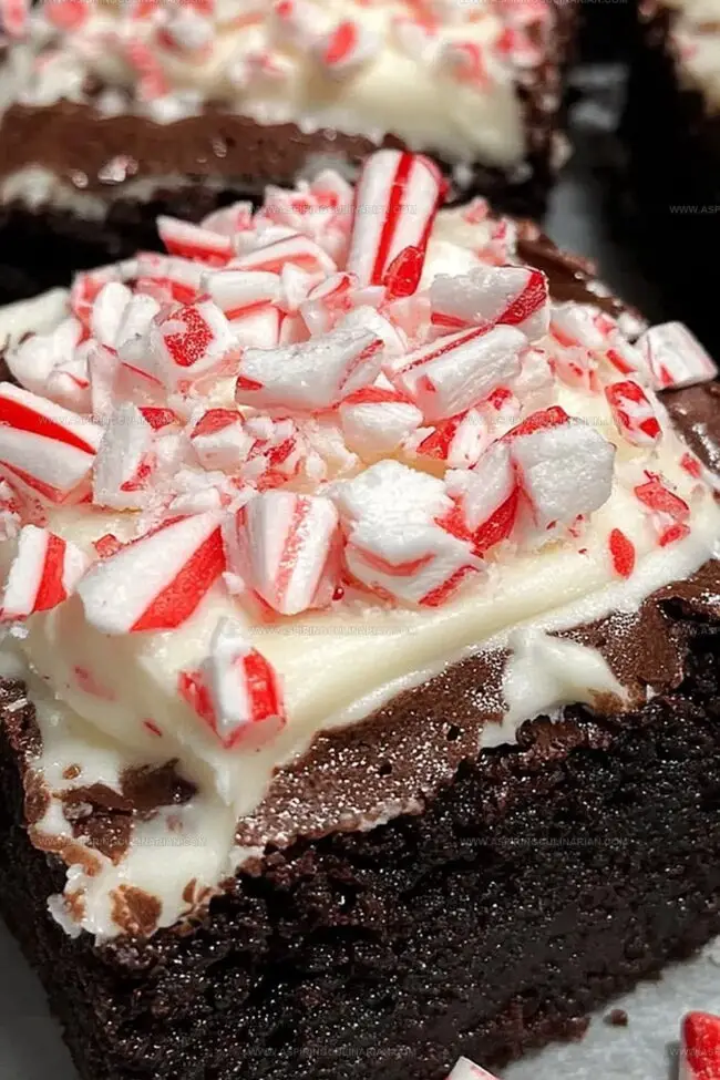 - Adorn the cooled brownies by spreading the peppermint frosting across the surface, creating artistic swirls with a knife. Garnish with crushed candy canes for a festive touch, then slice into individual squares and serve.