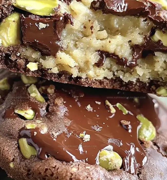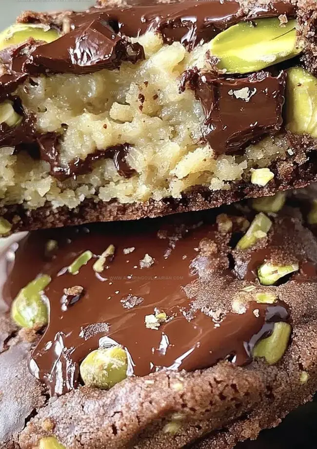 Chunky chocolate cookies stuffed with luscious pistachio cream become an irresistible Mediterranean-inspired dessert. Rich chocolate envelops creamy pistachio centers, creating a luxurious treat that melts deliciously on your palate.