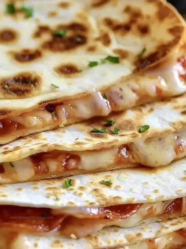 Crispy pizza quesadillas merge Italian and Mexican cuisines into one delightful dish. Cheese, pepperoni, and marinara sauce create a quick, satisfying meal you’ll crave again and again.