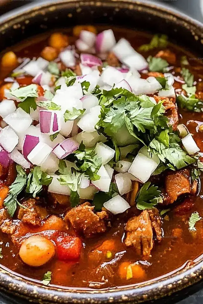 This hearty soup combines tender pork, rich chile sauce, and hominy for a traditional pozole-style dish that offers deep, complex flavors unique to Mexican cuisine.