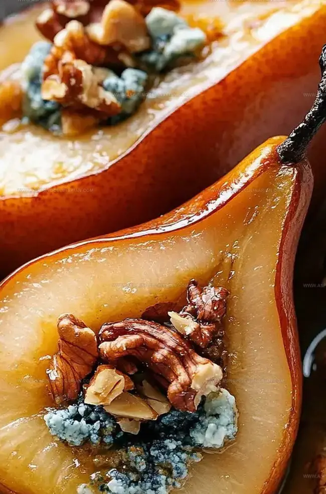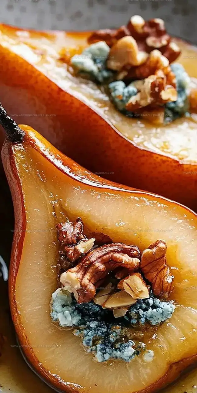 - After the initial baking, remove the foil and carefully spoon the blue cheese mixture into the hollowed pear centers.
