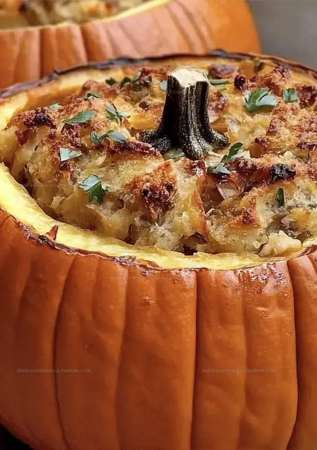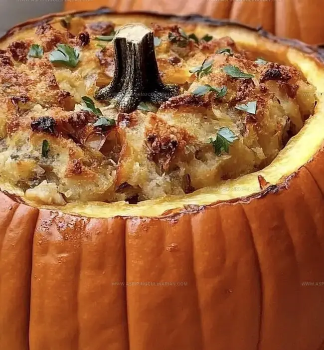 Layers of savory ingredients nestle inside a golden-baked pumpkin shell, creating an irresistible experience.