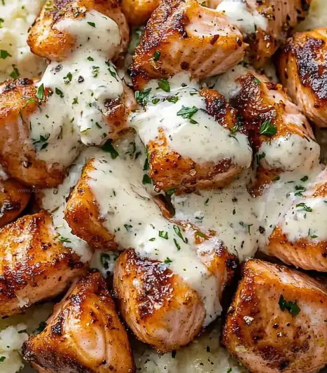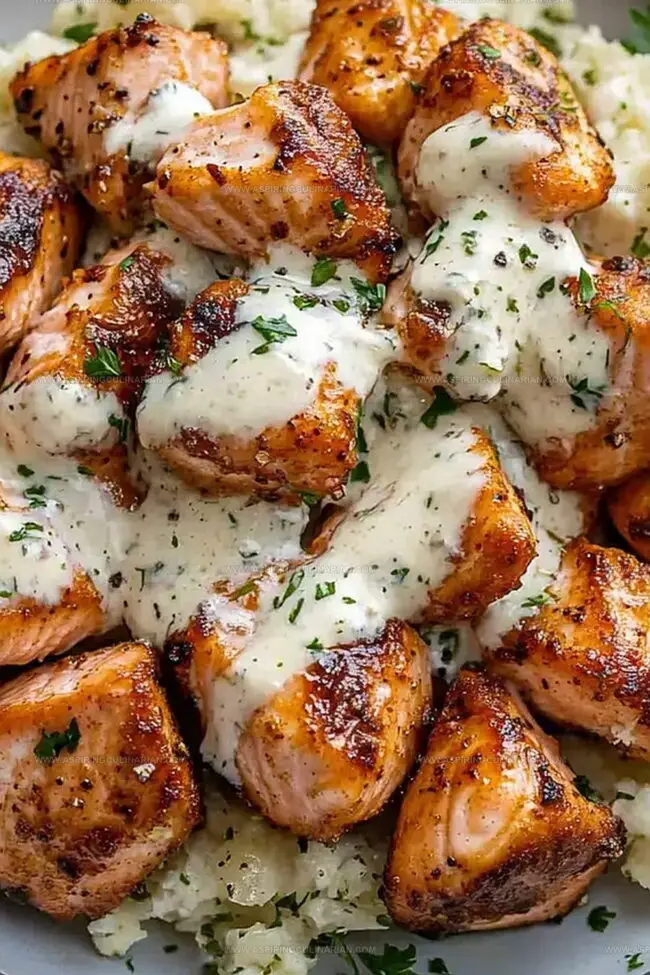 - Transfer perfectly cooked salmon bites to serving platter and generously drizzle warm cream sauce over top.