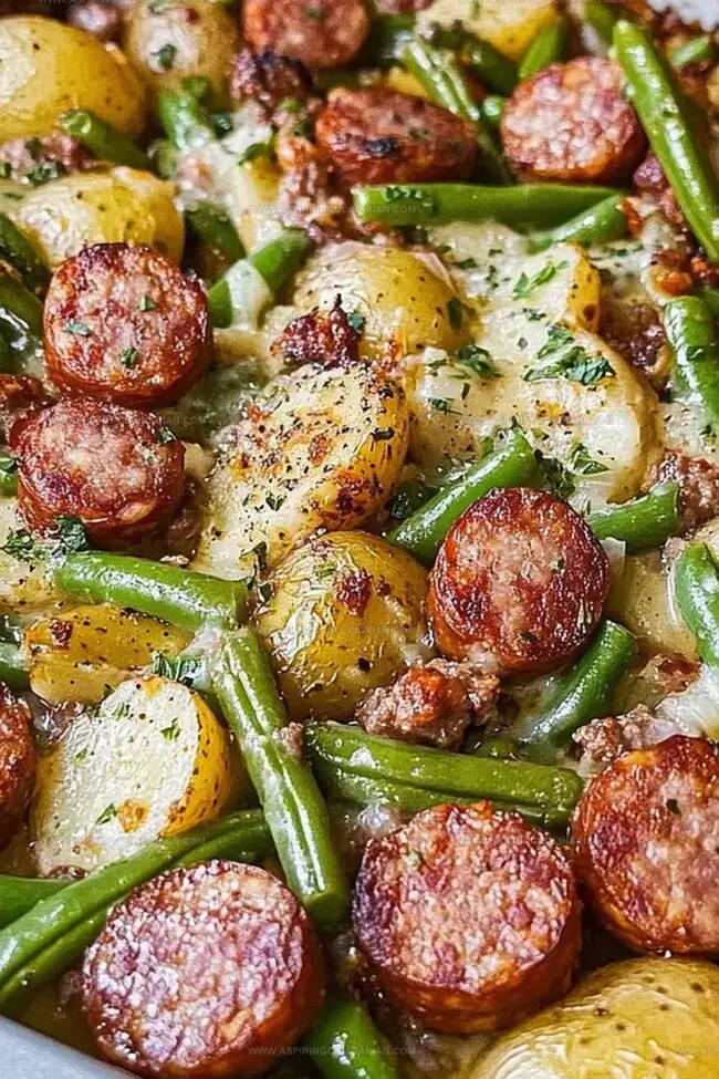 Packed with robust flavors and wholesome ingredients, this dish blends tender potatoes, savory sausage, and crisp green beans into a delightful one-pan meal.