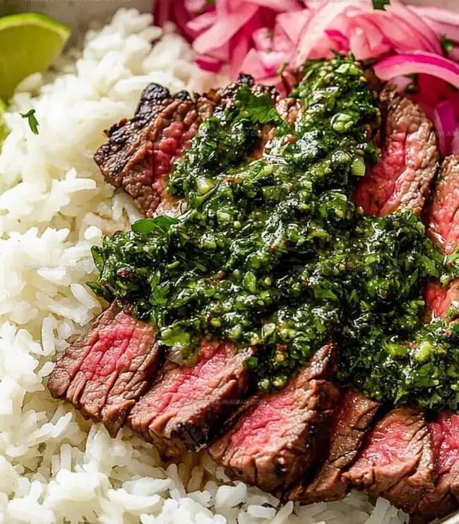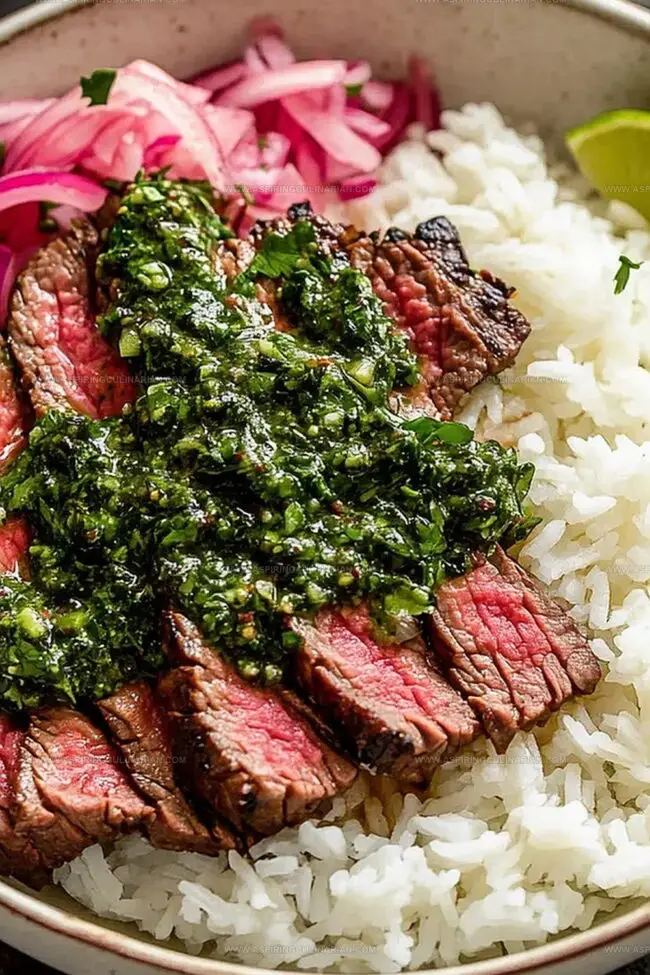 - Construct the rice bowls by layering fluffy rice as a base, arranging the sliced steak on top, and generously drizzling with the fresh chimichurri sauce.